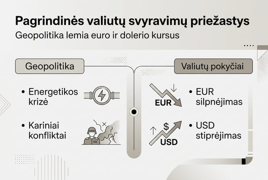 - Pasaulinių valiutų kursų svyravimai dėl geopolitikos: euras, doleris, svaras, jena