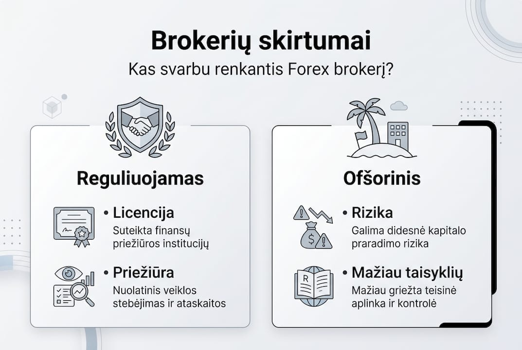 Reguliuojami brokeriai suteikia neigiamo balanso apsaugą, lėšų atskyrimą ir kompensavimo schemas, tačiau taiko sverto ribas; ofšoriniai brokeriai lankstesni, bet be tos pačios klientų apsaugos.