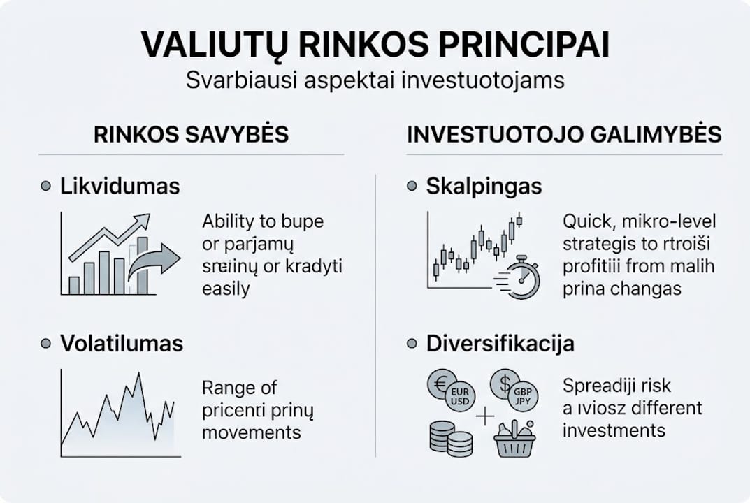valiutų rinkos ilgai buvo laikomos tik bankų, stambiųjų korporacijų ar profesionalių traderių teritorija. tai klaidingas įsitikinimas, kuris atbaido daugelį individualių investuotojų nuo vienos likvidžiausių ir dinamiškiausių finansų rinkų pasaulyje. šiame straipsnyje išnagrinėsime, kas iš tikrųjų yra valiutų rinkos, kaip jos veikia, kokie dalyviai formuoja kursus ir kokios strategijos bei rizikos valdymo metodai leidžia investuotojams dirbti šioje aplinkoje efektyviai. nesvarbu, ar tik pradedate, ar jau turite patirties, čia rasite praktiškai naudingų įžvalgų.