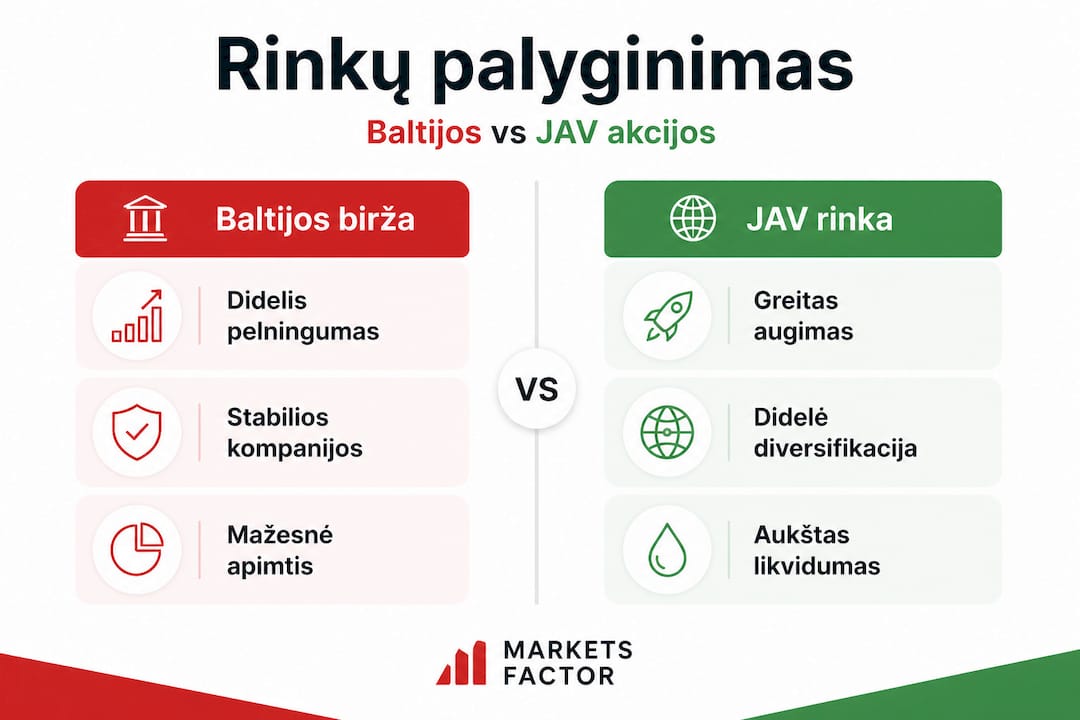 Diversifikacija tarp Lietuvos rinkos (kur galima gauti patrauklių dividendų) ir užsienio rinkų (kur didesnis augimo potencialas) yra viena efektyviausių rizikos valdymo priemonių paprastam investuotojui, kaip nurodo ekspertų strategijų analizė.