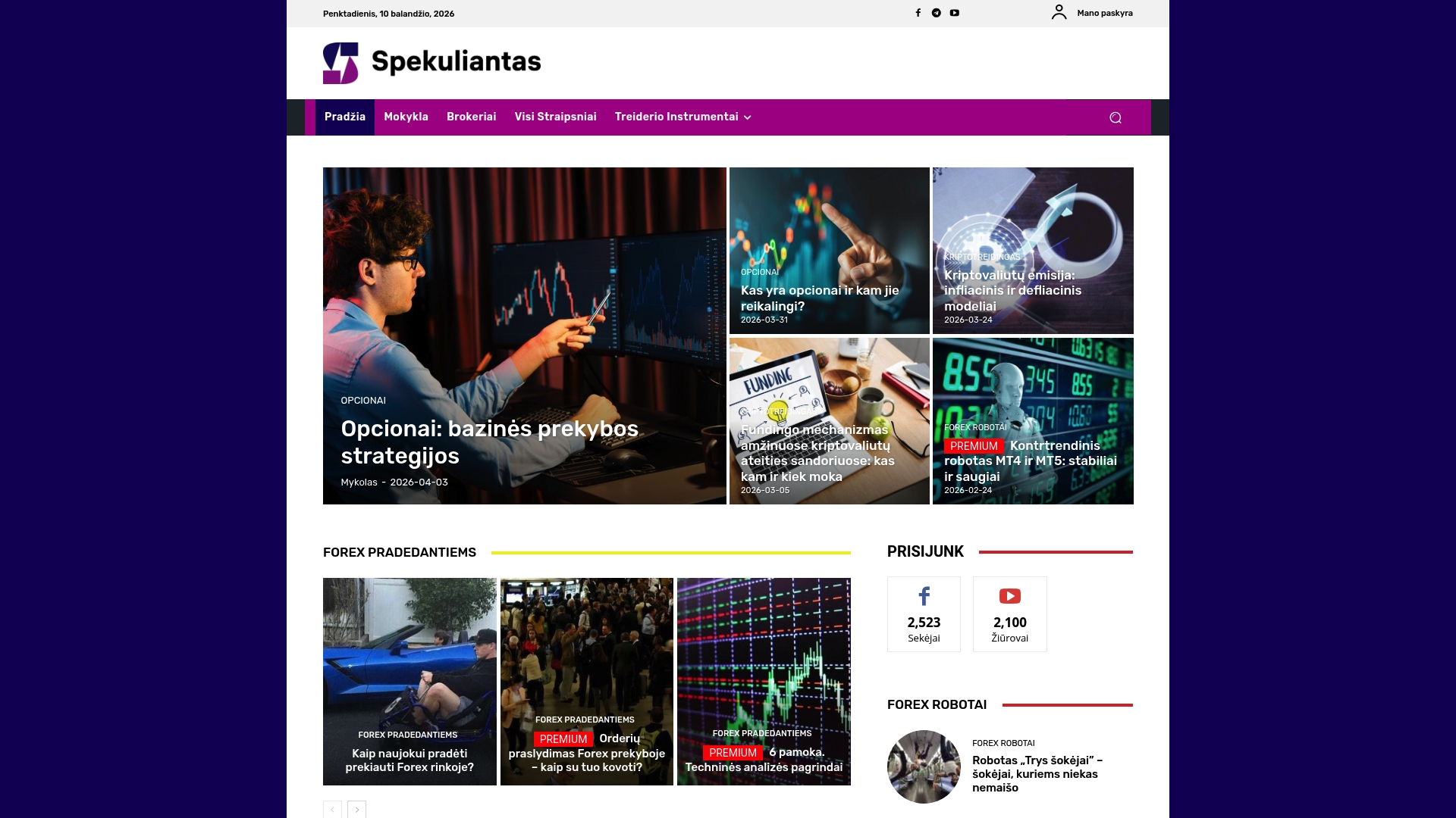 | Spekuliantas | Forex ir kriptovaliutų analizė, kursai, koučingas. | Plati mokymų bazė, įrankiai strategijų testavimui. | Neteikia tiesioginių prekybos paslaugų, turinio struktūra gali būti sudėtinga. | Tinkama techninė analizė norintiems mokytis ir testuoti prekybos strategijas. |