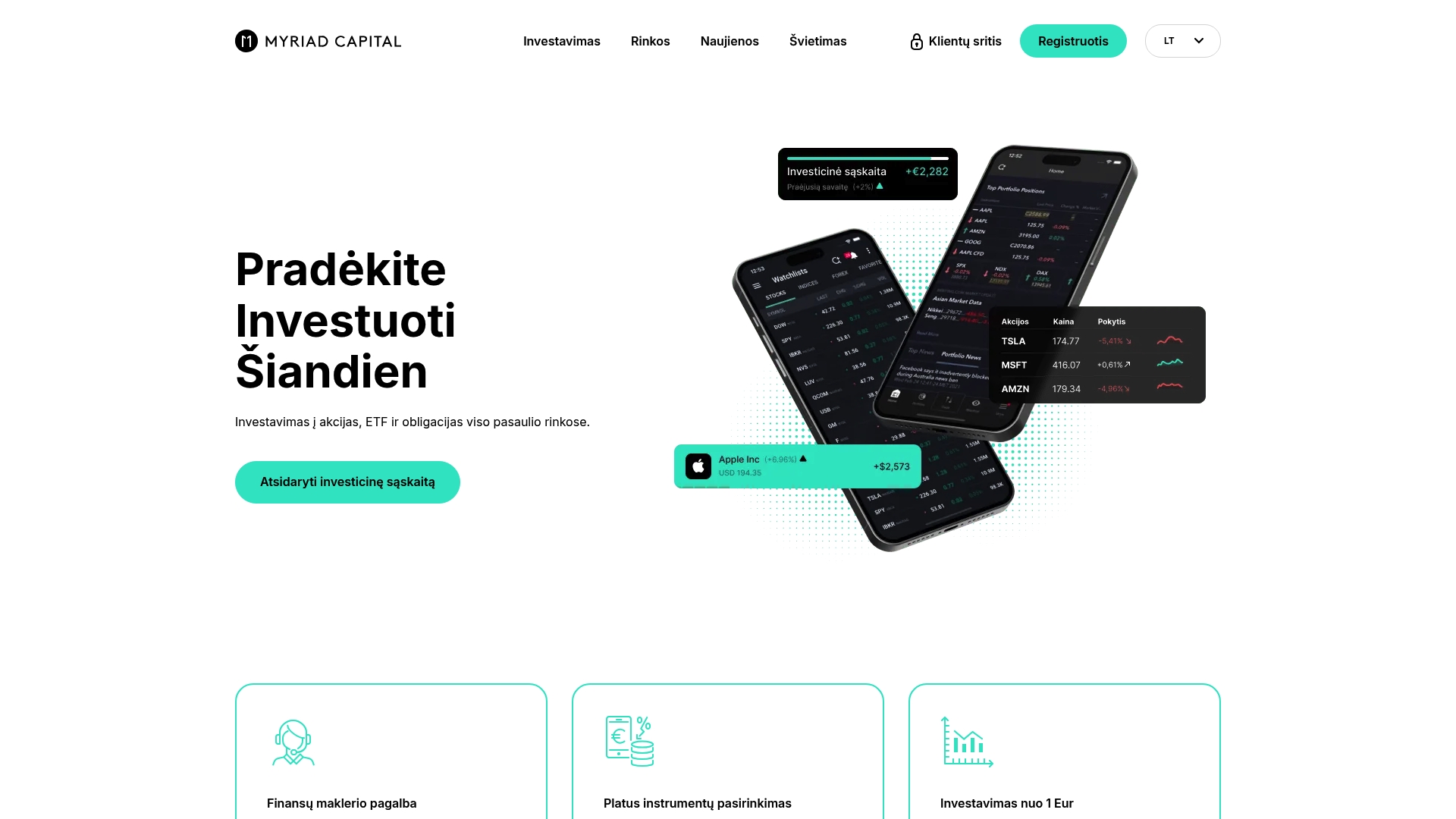 Myriad Capital išsiskiria kombinacija: reguliavimas, žemas minimalus įnašas ir plati pasaulinių biržų prieiga. Tai leidžia Lietuvos individualiems investuotojams pasiekti tarptautines rinkas be didelių pradinių investicijų.